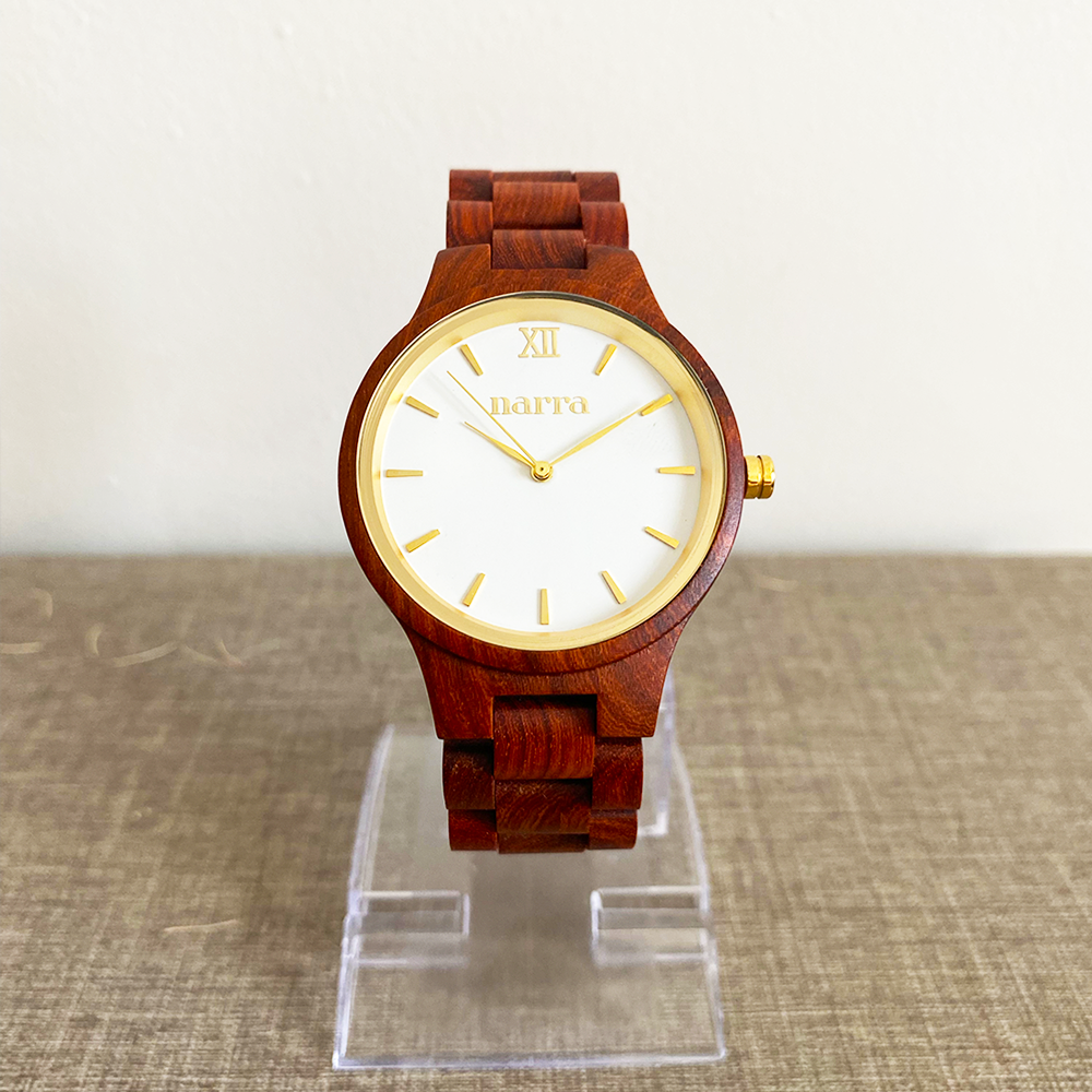 The Classic Dawn is a 40mm unisex wood watch that features a red sandalwood watch material with a white copper dial and Japanese movement.