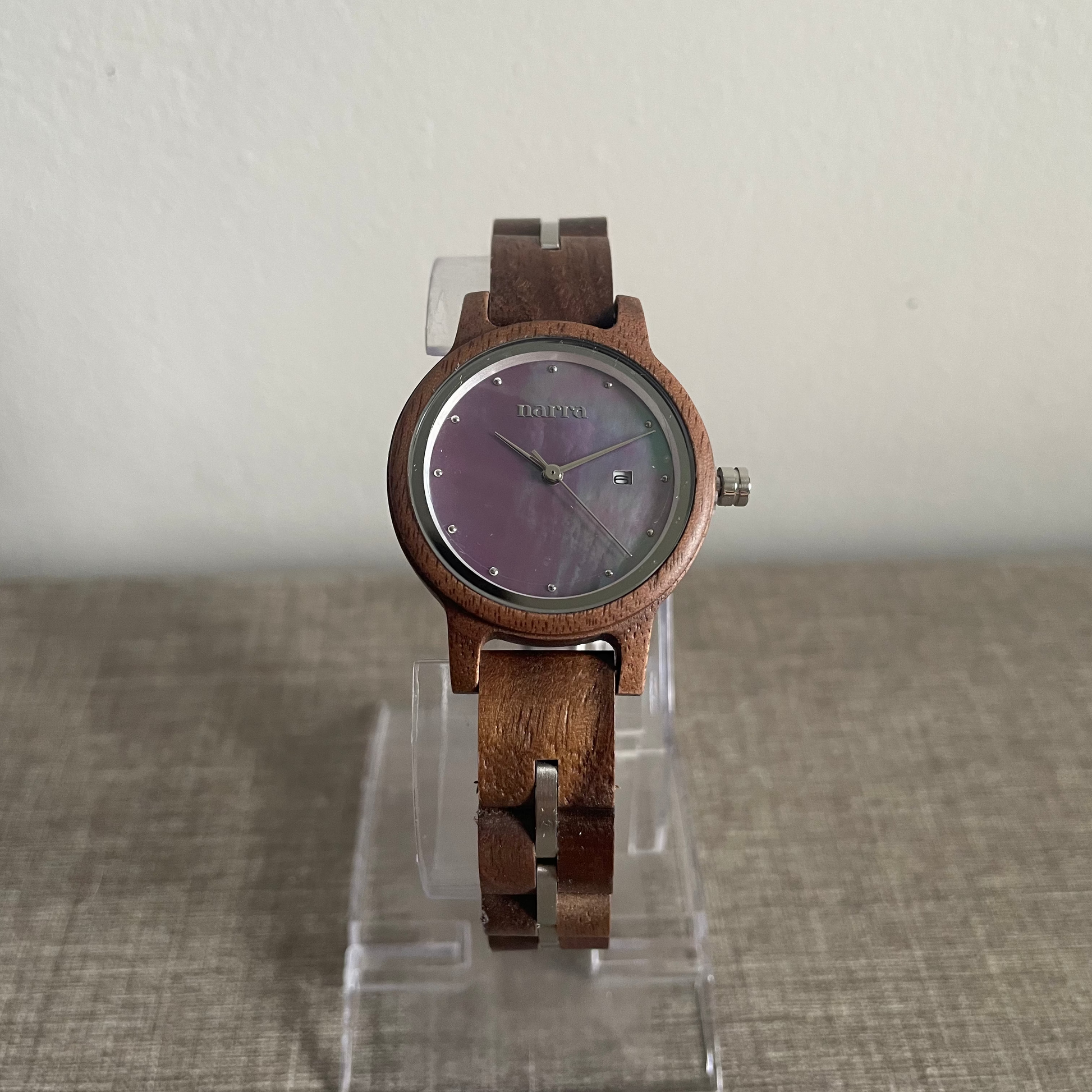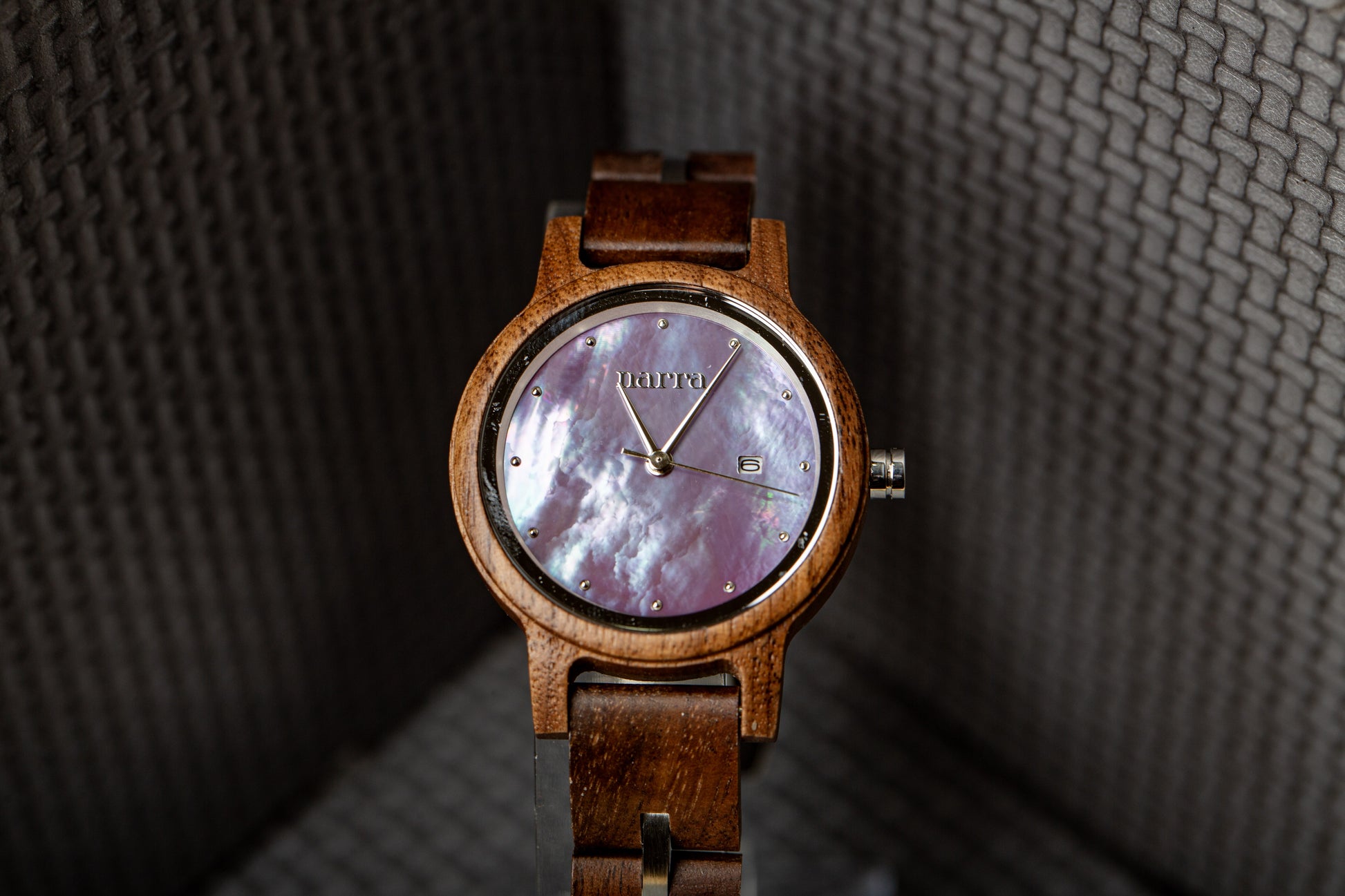 The Lyra is a 32mm women’s wooden watch crafted from walnut wood, featuring an iridescent purple mother of pearl dial inspired by the beauty of constellations.