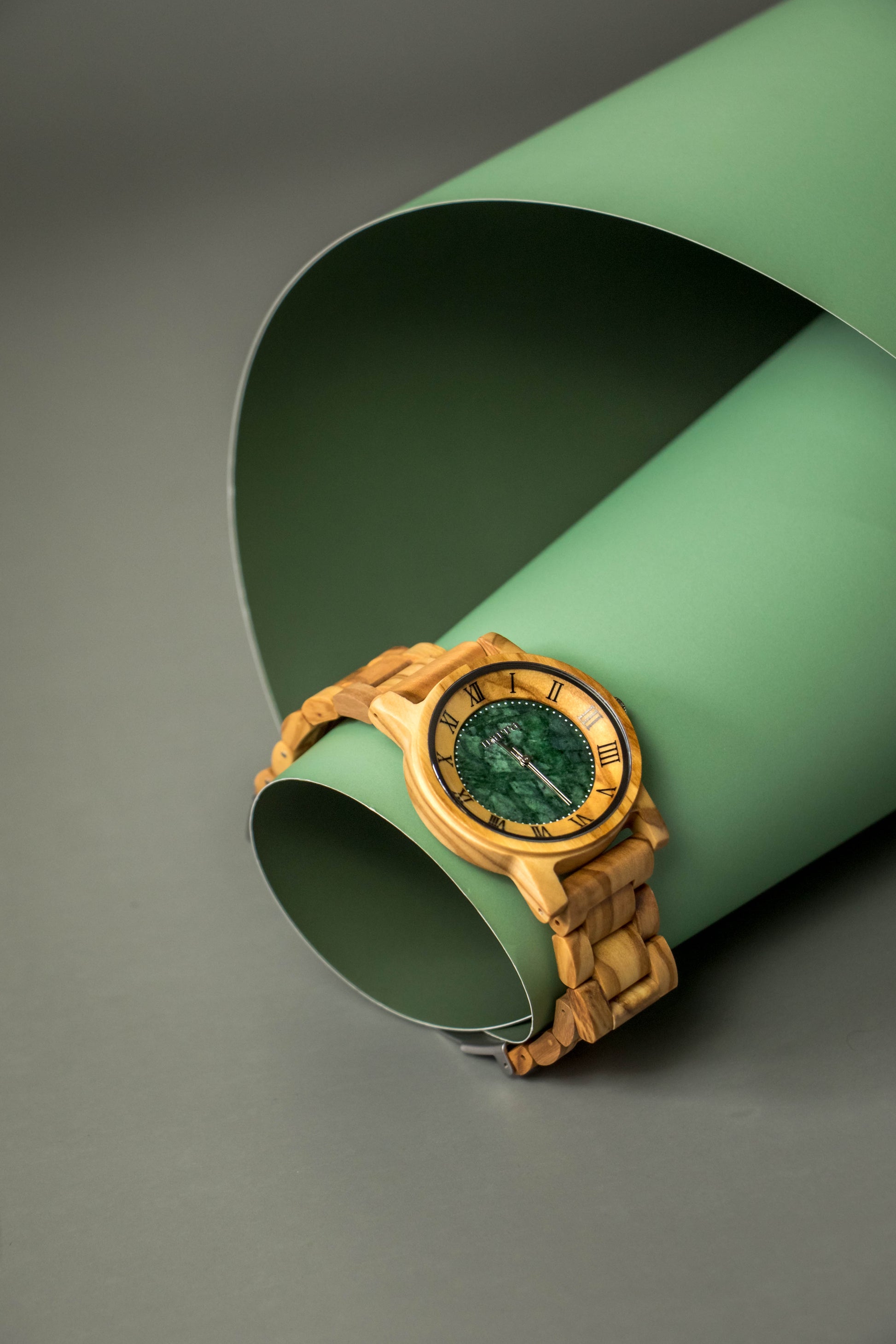 Oasis is a unisex wooden watch made with light brown olive wood and an olive green marble stone dial, and roman numeral indices.