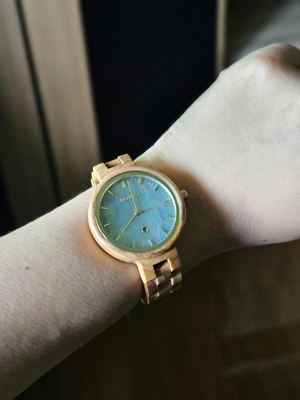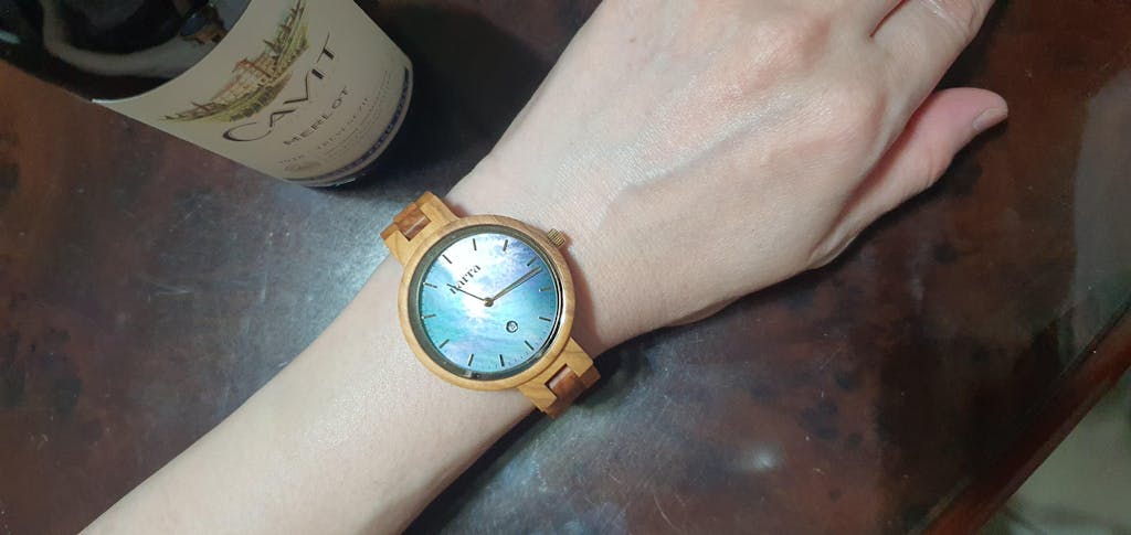 Tubbataha is a 35mm wooden watch for women that features an olive wood material with a blue pearl dial and a Japanese movement.